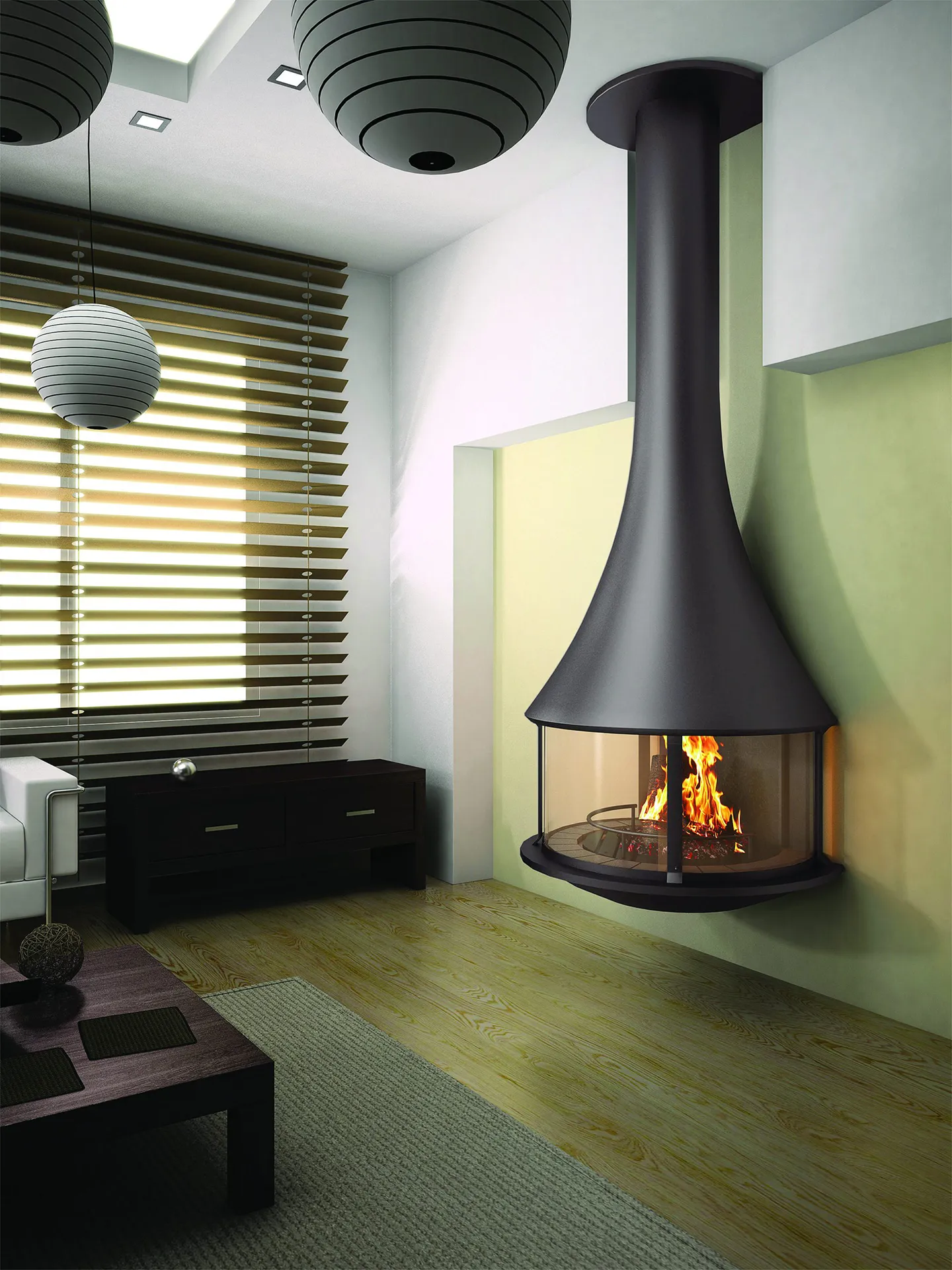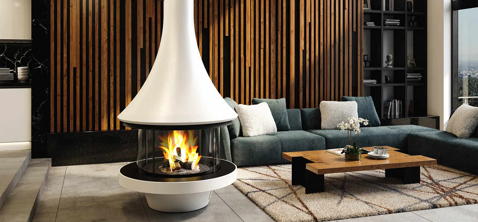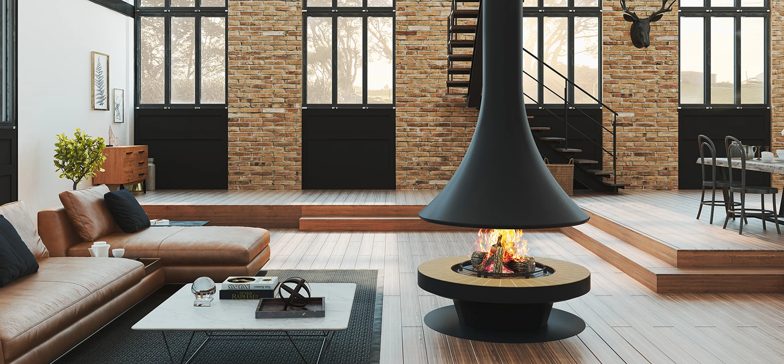 • 🔥 Cheminées centrales suspendues : des formes spectaculaires qui deviennent le cœur du salon.